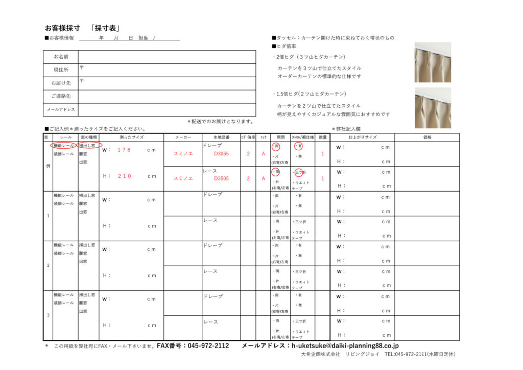 FAXでご注文 下記注文用紙(pdf)をダウンロードしてご利用ください。 カーテンサイズの測り方 ダウンロード(pdf_830KB)▶︎ 注文用紙 ダウンロード(pdf_450KB)▶︎ メールでご注文 ドレープカーテンの見積もり レースカーテンの見積もり ドレープカーテンの見積もり ドレープカーテンの見積もり お名前 (必須) ふりがな (必須) 郵便番号 (必須) 住所 (必須) ---神奈川県東京都埼玉県千葉県 市町村・番地 メールアドレス (必須) 電話番号 (必須) 【1】レールの種類 機能レール装飾レール 【2】窓の種類 掃き出し窓腰窓出窓 【3】測ったサイズ 幅(cm) 高さ(cm) 【4】メーカー名*メーカーを確認する ---日本フィスバサンゲツアスワンキロニースミノエシンコールリリカラ川島織物セルコン五洋インテックスフジエテキスタイルフェデポリマーブル東リマナトレーディングデコプラン 【5】生地番号 【6】ヒダ倍率 ヒダなし(フラットカーテン)1.5倍2倍(一般的な倍率) 【7】フック *フックの種類を確認する AフックBフック 【8】開閉 *カーテンの開き方のを確認する 両開き片開き 【9】タッセル 有り無し 【10】裾仕様 三つ折りウエイトテープ 【11】数量 1枚2枚3枚4枚5枚6枚7枚8枚9枚10枚 レースカーテンの見積もり お名前 (必須) ふりがな (必須) 郵便番号 (必須) 住所 (必須) ---神奈川県東京都埼玉県千葉県 市町村・番地 メールアドレス (必須) 電話番号 (必須) 《1種類め》 【1】レールの種類 機能レール装飾レール 【2】窓の種類 掃き出し窓腰窓出窓 【3】測ったサイズ 幅(cm) 高さ(cm) 【4】メーカー名*メーカーを確認する ---日本フィスバサンゲツアスワンキロニースミノエシンコールリリカラ川島織物セルコン五洋インテックスフジエテキスタイルフェデポリマーブル東リマナトレーディングデコプラン 【5】生地番号 【6】ヒダ倍率 ヒダなし(フラットカーテン)1.5倍2倍(一般的な倍率) 【7】フック *フックの種類を確認する AフックBフック 【8】開閉 *カーテンの開き方のを確認する 両開き片開き 【9】タッセル 有り無し 【10】裾仕様 三つ折りウエイトテープ 【11】数量 1枚2枚3枚4枚5枚6枚7枚8枚9枚10枚 お取り扱いブランド 下記メーカー名をクリックして頂くとメーカーサイトをご覧いただけます。 <カーテンメーカー> ●日本フィスバ ●サンゲツ ●アスワン ●キロニー ●スミノエ ●シンコール ●リリカラ ●川島織物セルコン ●五洋インテックス ●フジエテキスタイル ●フェデポリマーブル ●東リ ●マナトレーディング 【カーテンフックの種類】 【カーテンの開き方】